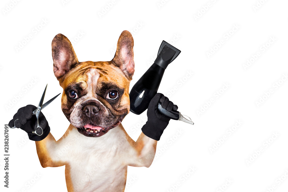 Schilderijen op glas Franse bulldog - french bulldog on white isolated background keeps hairdressing tools - Nikkel-Art.nl